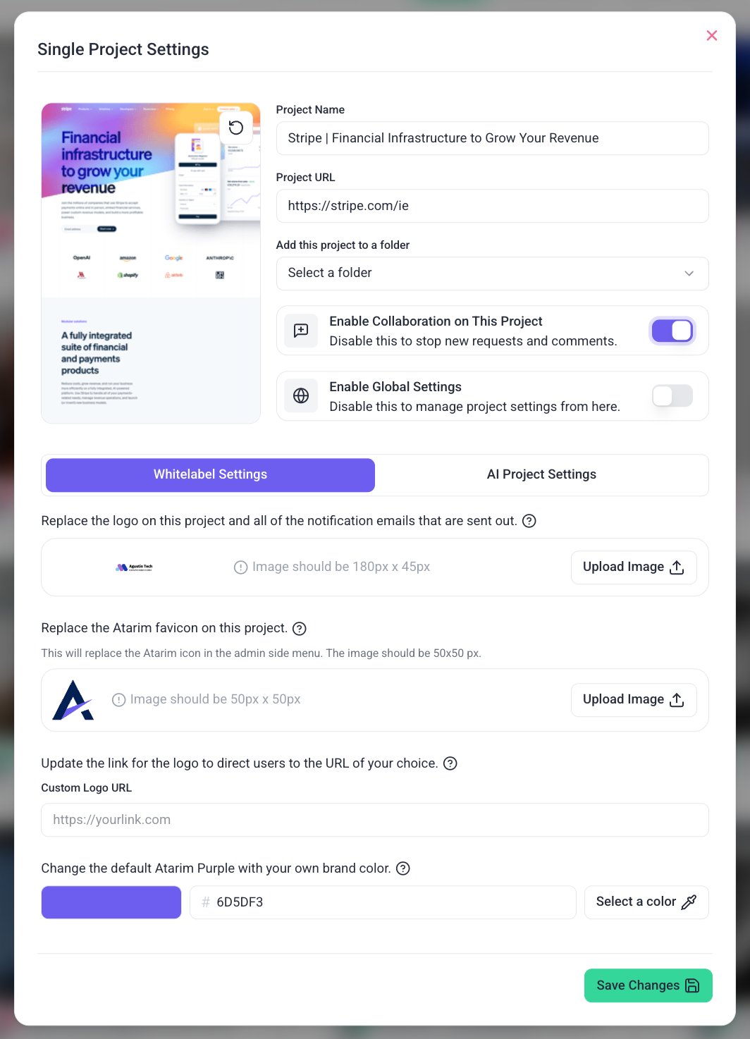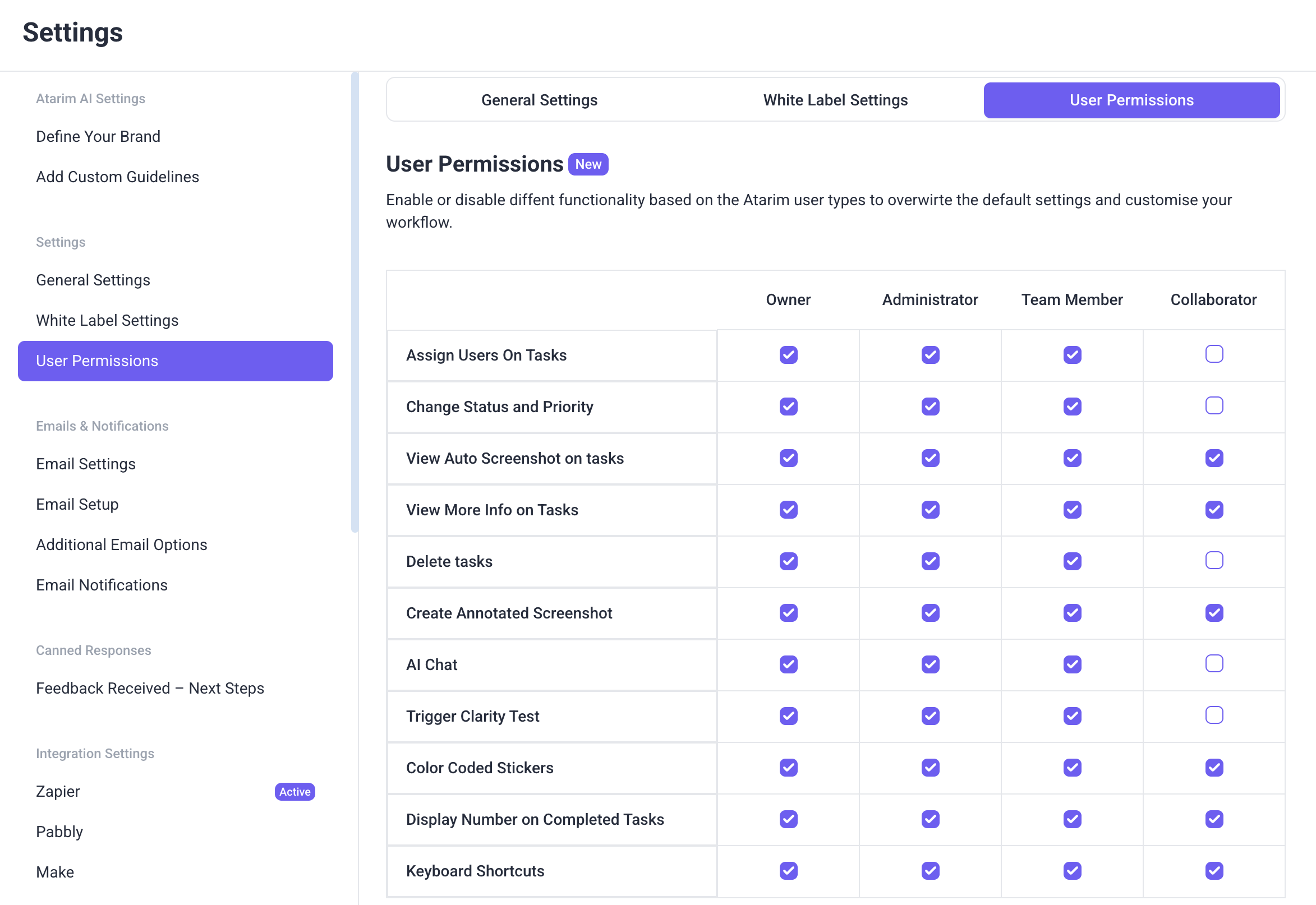 Atarim provides flexibility to set permissions globally across all projects. This can be done via the Settings menu, where administrators can configure what tools and options each role has access to throughout the platform. This applies only to the Visual Collaboration interface, not the rest of the dashboard.
